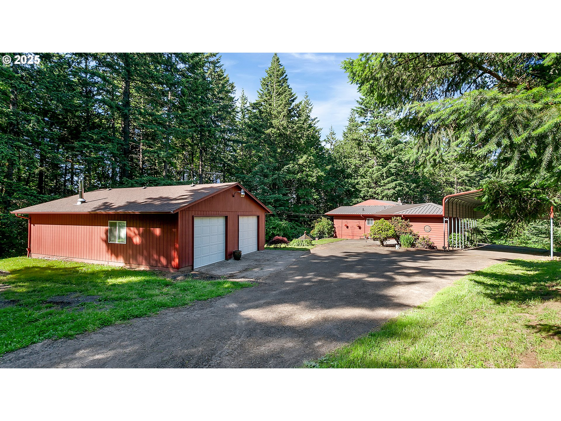 Incredible opportunity to own a tranquil, private, wooded, and grassy retreat on 5 acres with 3 bedroom, 2 bath, 2,076 square feet with a 3-acre buildable lot.Minutes from Gresham, Happy Valley, and Damascus.Daylight basement home on 1.9 acres nestled among towering evergreens. Large windows allow for lots of natural light.Main floor: Living room with three-sided floor to ceiling rock fireplace with slate hearth situated between living room and kitchen. One bedroom and full bath. Kitchen features 12' ceilings, stainless steel appliances, granite and large island. Slider opens to large 50' covered wrap-around deck for year-round use and beautiful views.Daylight basement features large family room with floor to ceiling brick fireplace with gas insert. 2 bedrooms, bathroom, large utility room. Slider off family room leads to wrap-around patio and access to fenced yard.Newer updates include HVAC high-efficiency gas furnace, heat pump, and gas hot water heater, most plumbing lines replaced with PEX water lines.Wood laminate flooring in most areas.High quality, low maintenance metal roof.Detached 28' X 36' garage/shop with room perfect for crafts, studio, office, etc. and separate entrance.41' L x 14' W x 16' H covered RV parking with 50 amp and RV dump. Perfect for largest RVs.Carport with attached shed with electricity and built-in shelves.Room to breathe, space to grow, and flexibility to fit your future.Owned by one family for 50 years, truly must see property to fully appreciate.View by appointment only. Seller offering 1 Yr APHW warranty with acceptable offer. Call for details. OPEN SUNDAY 11/30 2-4PM Detached 3 garage spaces (in addition to the attached carport & detached RV carport) + separate finished space with exterior door (could remove wall for 4 tandem) which would make a great shop, home office, gym, studio, storage or she shed/man cave!